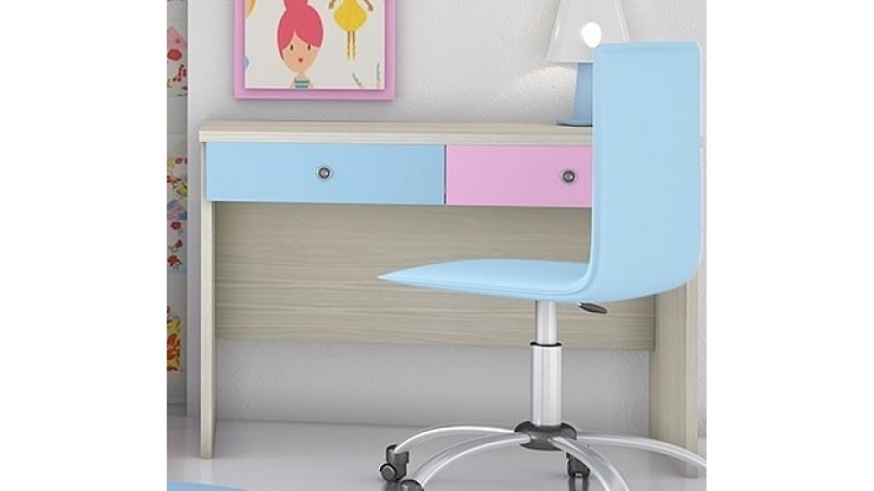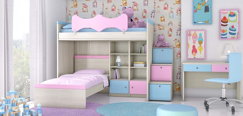 Παιδική κουκέτα από μελαμίνη με έναν αρμονικό συνδυασμό του ροζ με το σιέλ, έτσι ώστε να φιλοξενήσει κορίτσια και αγόρια.